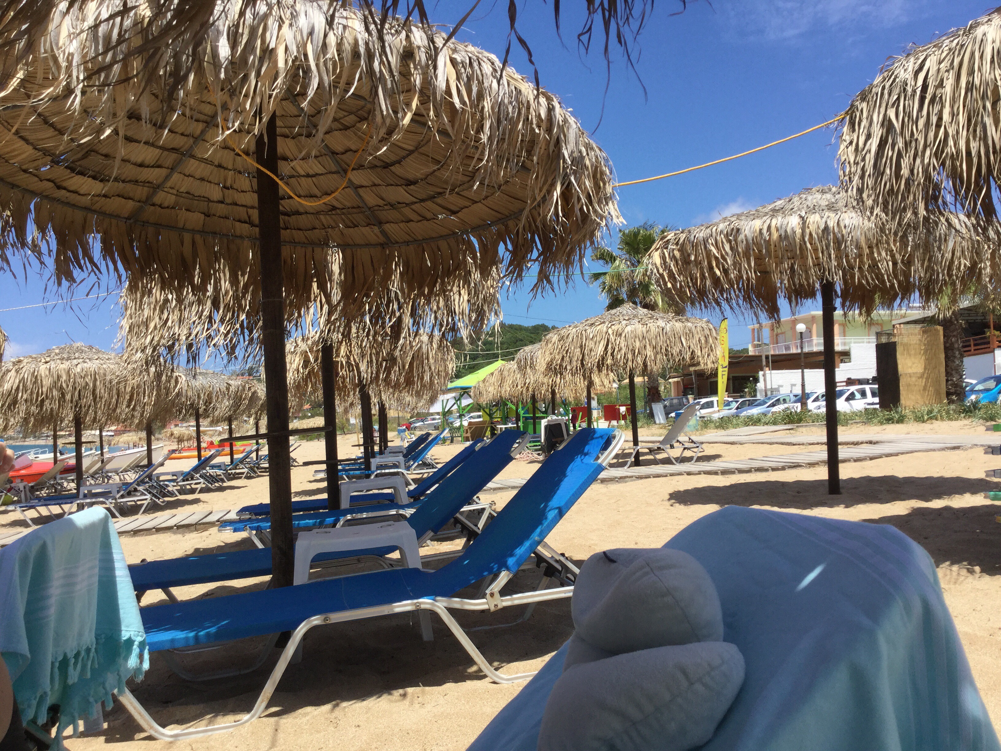 Der Strandliegenoberaufseher und der ständig zwischen Strand und Poolbar pendelnde Typ vom ambulanten Beimirkannstduallesbestellen-Service weigern sich beharrlich, auf unser Touri-Griechisch zu reagieren. So radebrechen wir uns in Englisch durch den Tag. Zur Realsatire wird’s, als eine Deutsche ein Radler mit mehr Limo als Bier bestellen will.