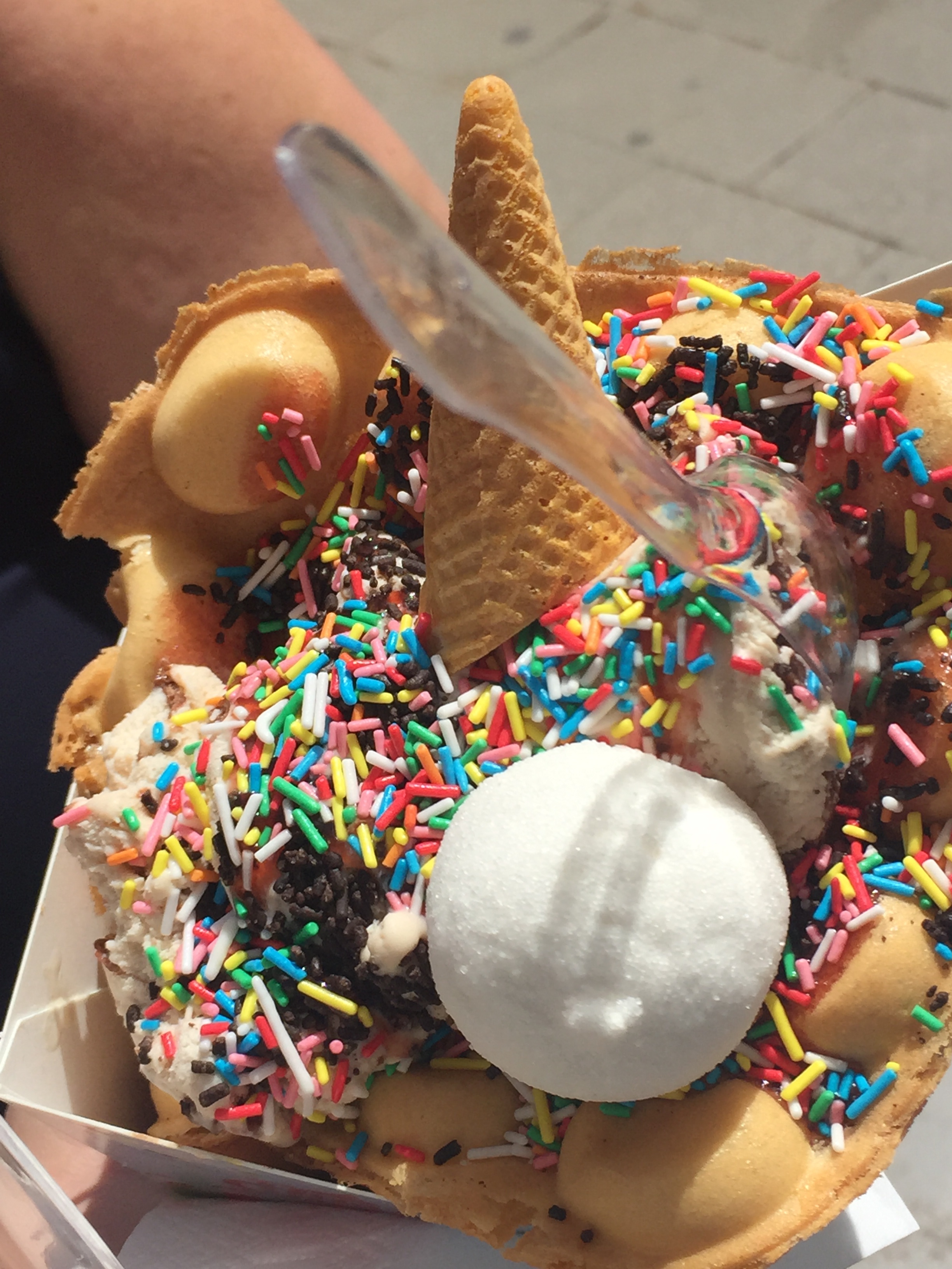 Neu zu entdecken ist auch ein Eisladen mit dem Namen „Hans & Gretel“. Aber was heißt hier Eisladen? Es ist ein Wirklichkeit gewordener Traum in süß! Liebevoll dekoriert, bunt, schrill, originell. Eis, Waffeln, Soßen, Drinks, Marshmallows, Streusel, …. alles nach Lust und Laune kombinierbar. Was wir dann auch tun. Unsere Kreation dürfte so um die 2.000 Kalorien haben und schmeckt teuflisch gut.