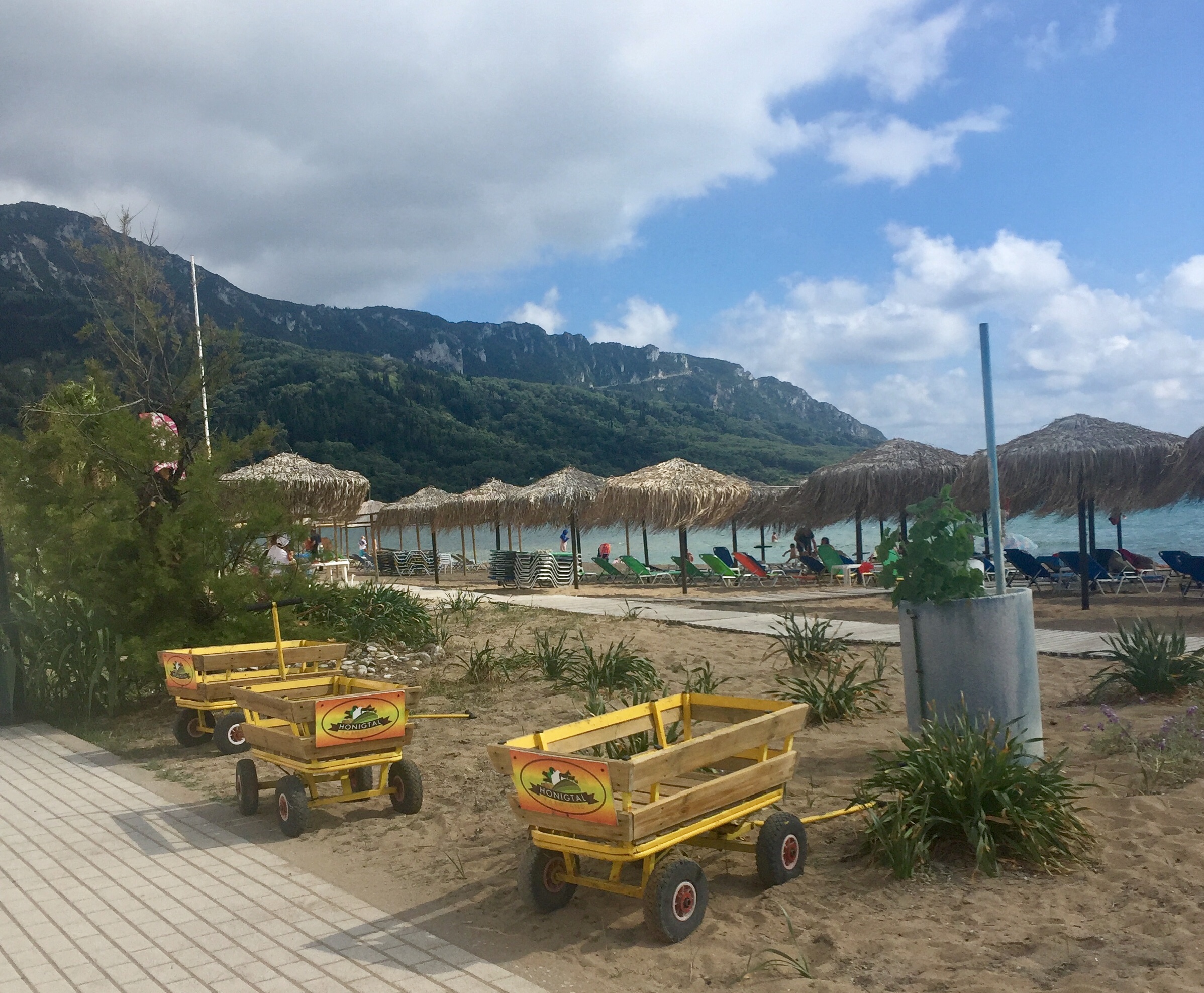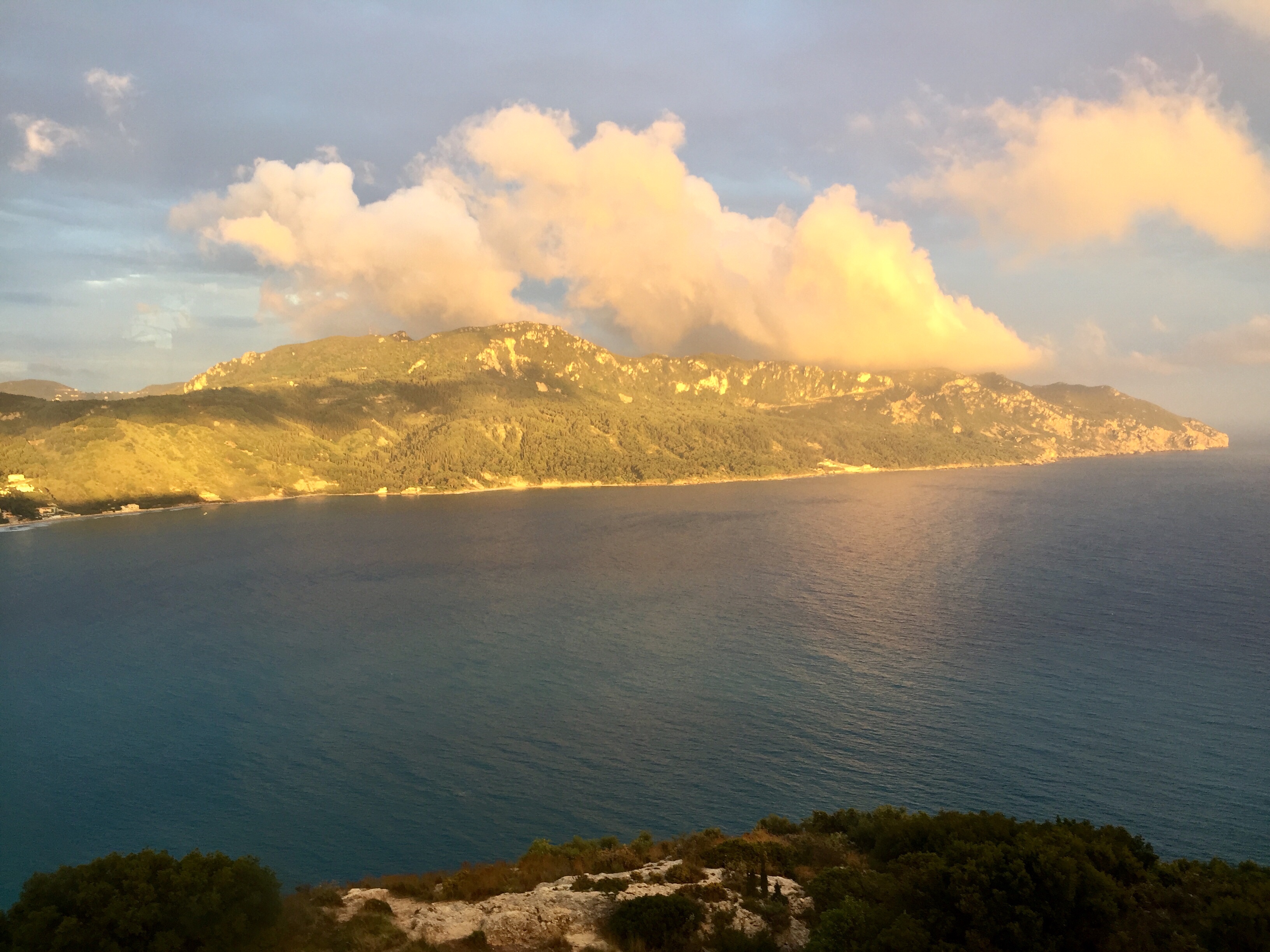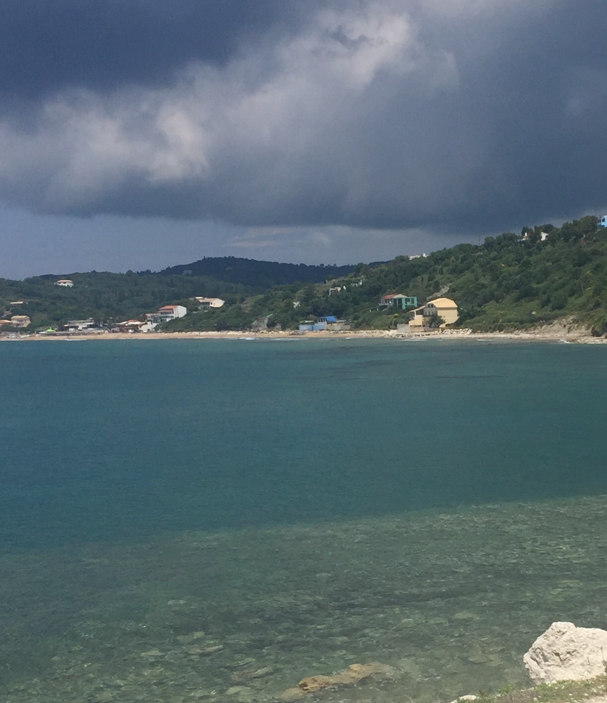 Zunächst einmal zum Wetter: die griechische Vorhersage für Korfu (bewölkt, regnerisch, nachmittags Gewitter) wird wohl hier an der Nord-West-Küste nicht anerkannt. Es herrscht eitel Sonnenschein. Die bedrohlich schwarzen Wolken werfen ihre Schatten nur Richtung Inselmitte und Ostküste.