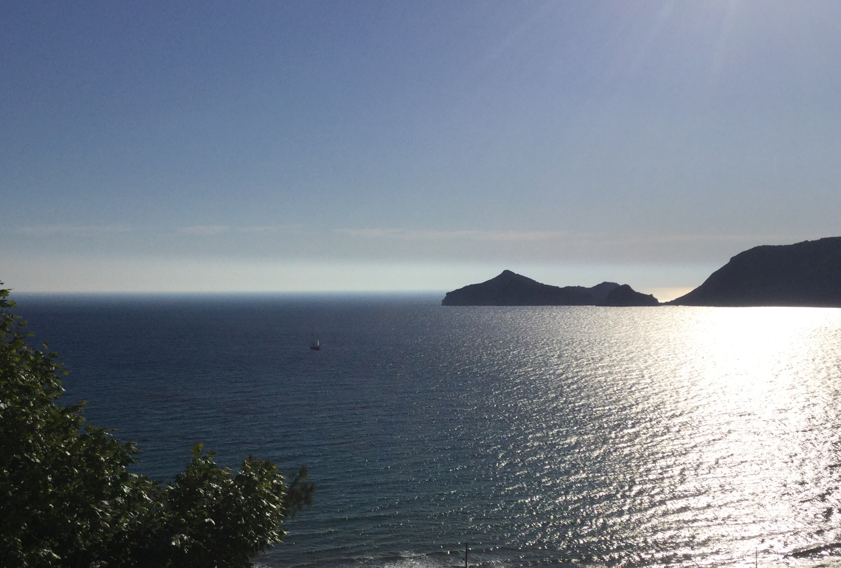 Vom Balkon der Blick auf die tiefschwarze Bucht, von der ein Keil vom Licht der noch schmalen Mondsichel unnatürlich hell erleuchtet wird. Zum ersten Mal weben Zickaden ihren Klangteppich, auf dem sich das niemals endende sanfte Rauschen der auf die Küste treffenden Wellen niederlässt.