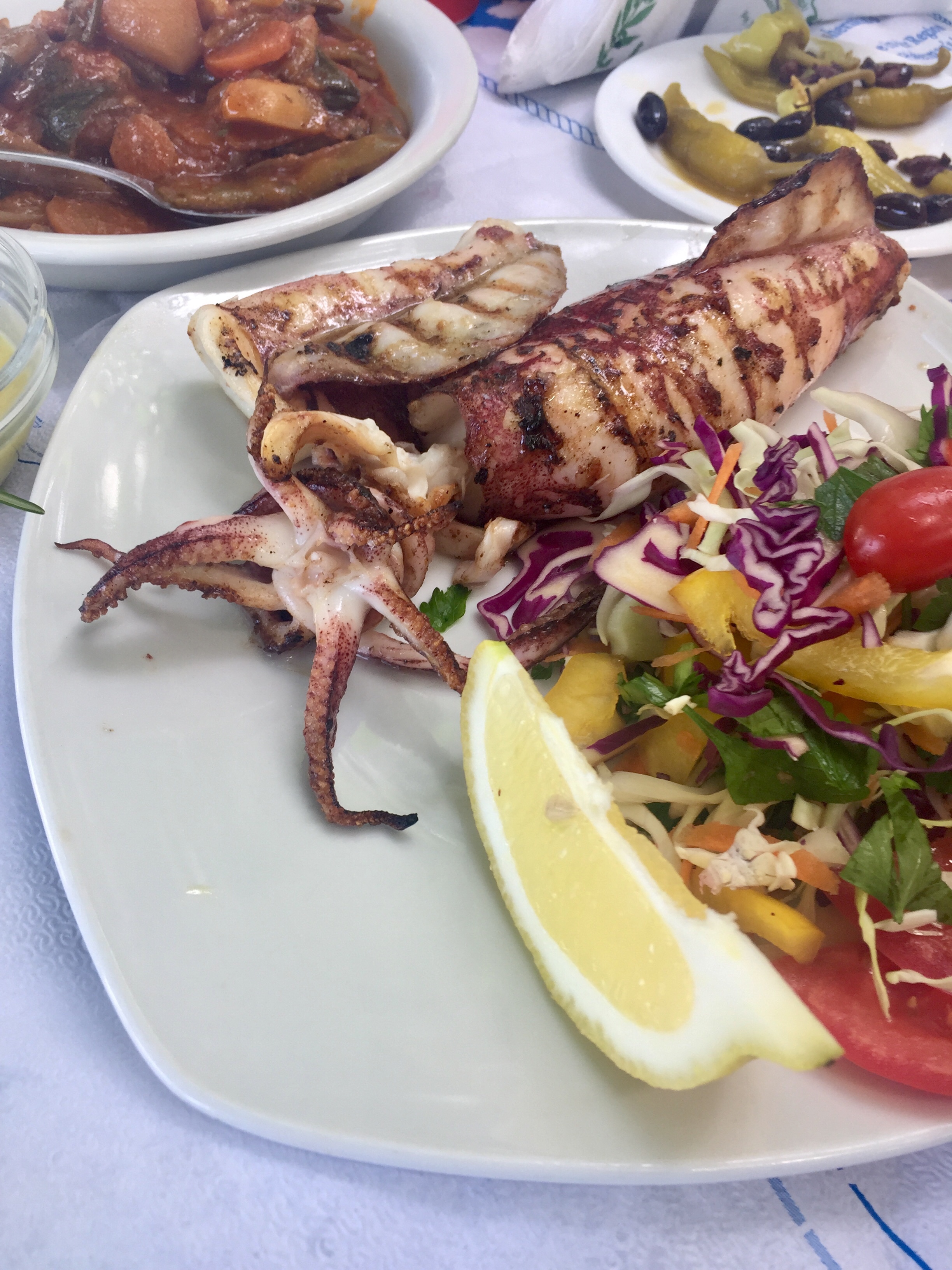 Für den kleinen Hunger wird ein kleiner Tintenfisch bestellt. Eigentlich hatte ich ja die frittierten Dinger im Kopf. Stattdessen: