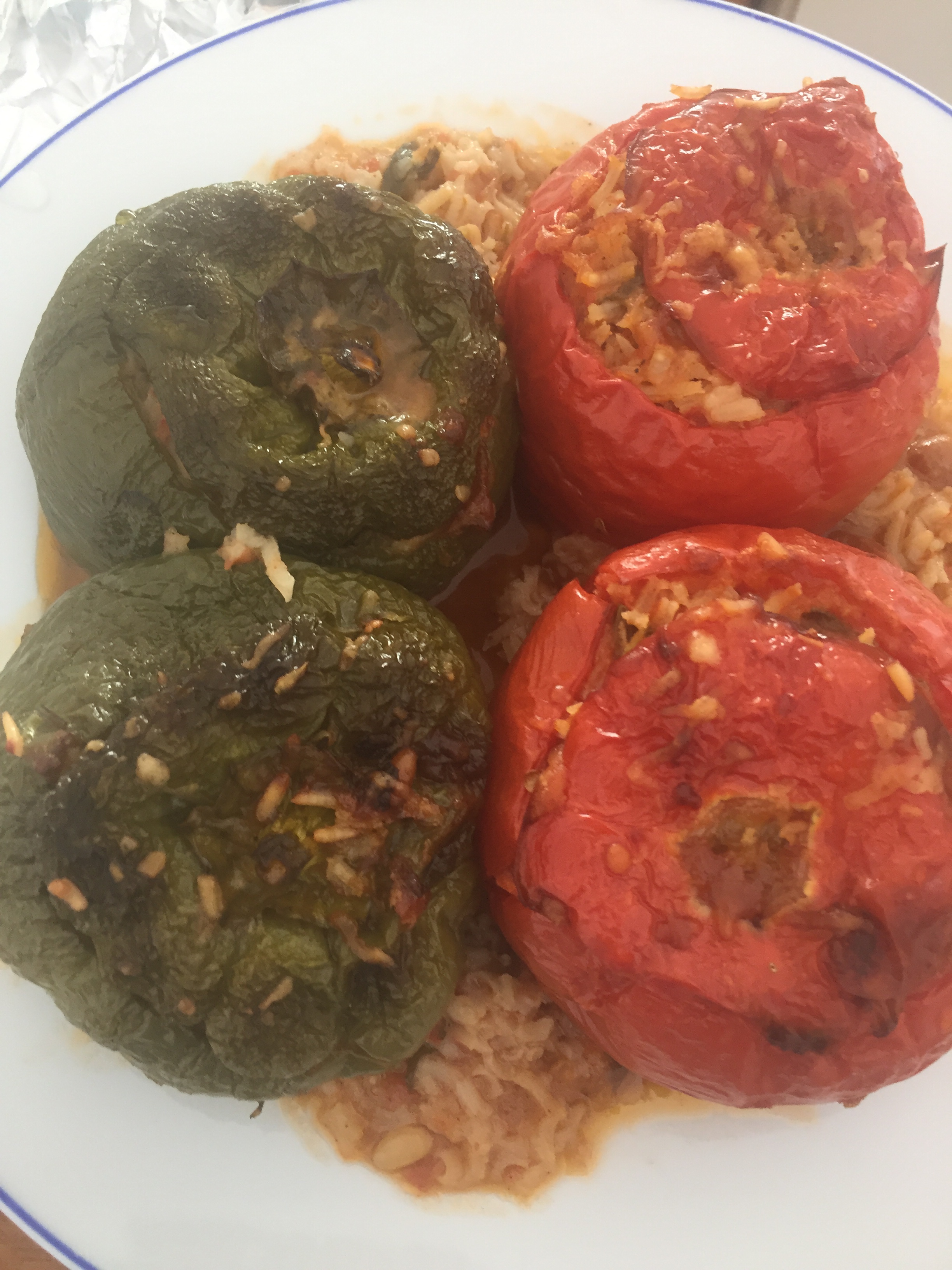Maria hat uns γεμιστές πιπεριές (gemistes piperies), gefüllte Paprika auf die Küchentheke gestellt. Vier (!) Stück, jede so groß wie ein Babykopf. Wir scheinen wirklich unterernährt auszusehen.