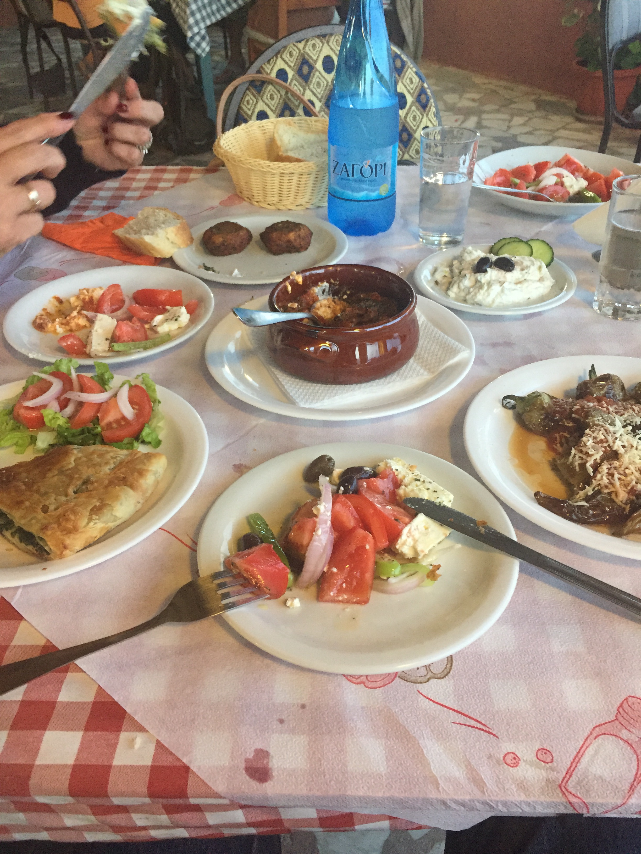 Zum Teil stehen die Tische noch drinnen. Zu unbeständig, das Wetter. Die Vorspeisenplatte und Pastitsio. Foto per Whatsapp in die Heimat. Bisschen Neid erzeugen.