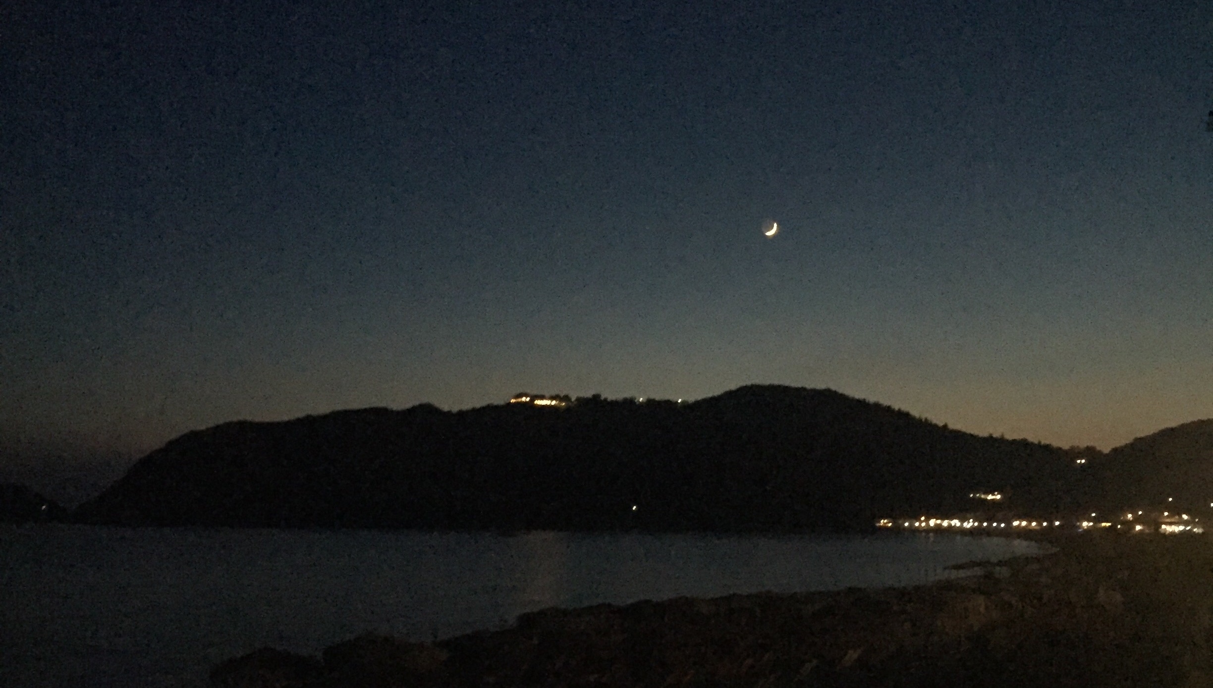 Kaum, dass wir auf dem Balkon sitzen, fällt in der gesamten Bucht der Strom aus. Nur noch der Mond und ein Sternenmeer über uns. Unheimlich fast. Nach fünf Minuten gehen alle Lichter wieder an. Schade eigentlich.