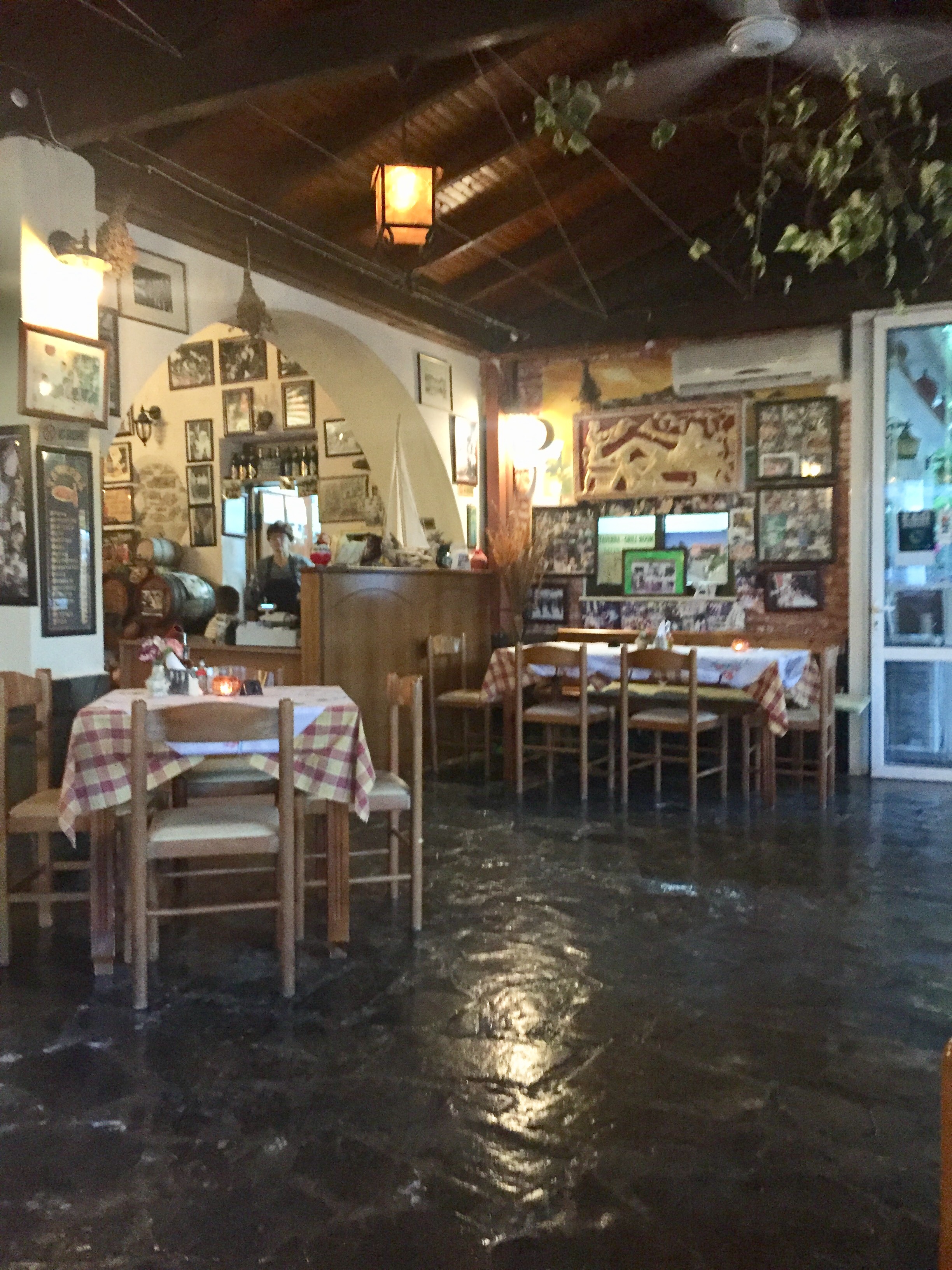 In der Taverna werden wir vom Wirt und seinen erwachsenen Söhnen herzlich empfangen. Die sonst offene Terrasse ist noch regengeschützt verschlossen und alles wirkt irgendwie düster.