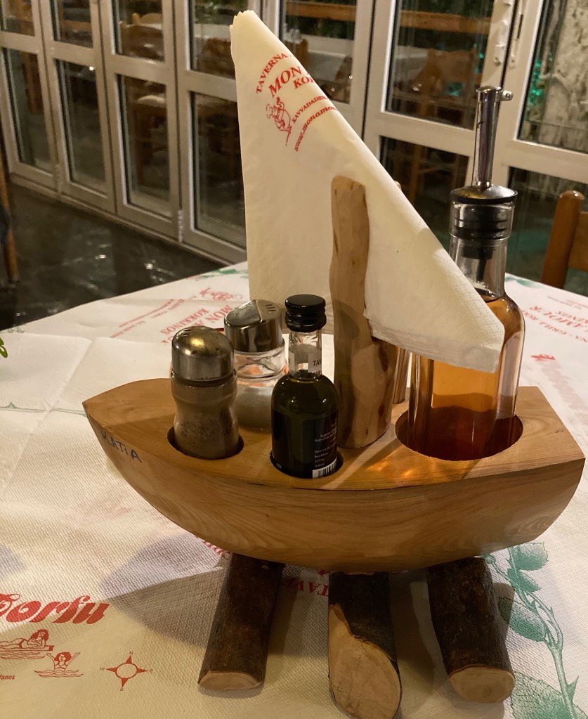 Anschließend nach Kavvadades zum „Mon Amour“. Eine immer noch authentische Taverne. Im Eingangsbereich ein großer Tisch mit Desinfektionsmitteln, Tüchern und sogar Masken. Ich bestelle Lamm vom Spieß und als Vorspeise Salat, Taramas, Tsatsiki, Pitabrot. Der Tisch ist voll und ich genieße es. Hinterher gibt’s Obst und Ouzo auf‘s Haus. Für drei Personen zahle ich inklusive Getränke 32,00 Euro.