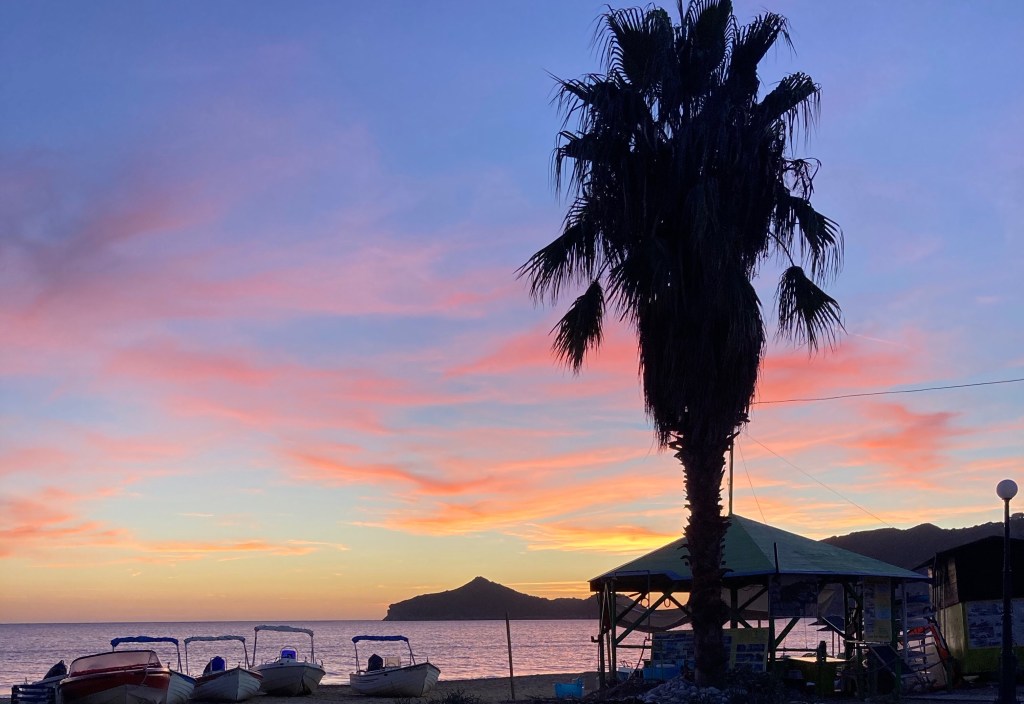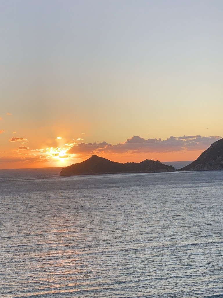 Um diese Jahreszeit geht die Sonne bereits um 19:15 Uhr unter. Wir schaffen es nicht mehr, das Schauspiel von Afionas aus, hoch über der Bucht, zu genießen. Aber der Blick vom Balkon ist auch nicht schlecht.