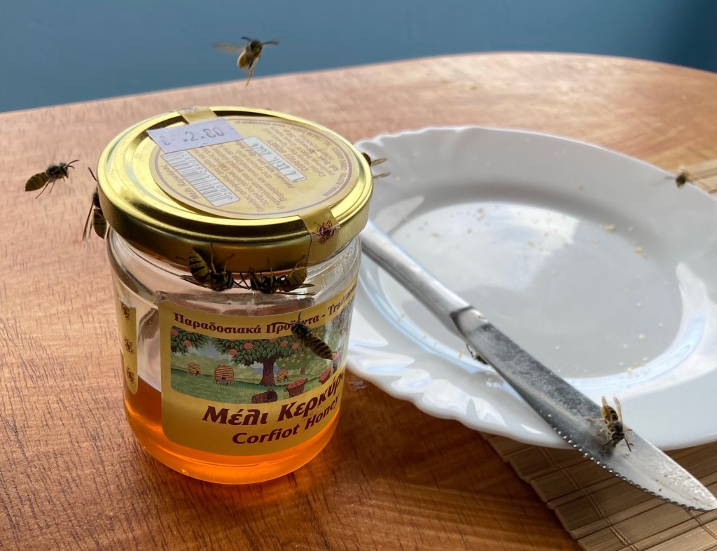 Als wäre man nie weg gewesen. Erst runter zu Spiros, wo der Mittlere und „dä Kleen“ schon warten. Dann gemeinsames Frühstück auf dem Balkon. Gemeinsam mit vielen ungeladenen Gästen: Wespen! Eine regelrechte Plage in diesem Jahr.
