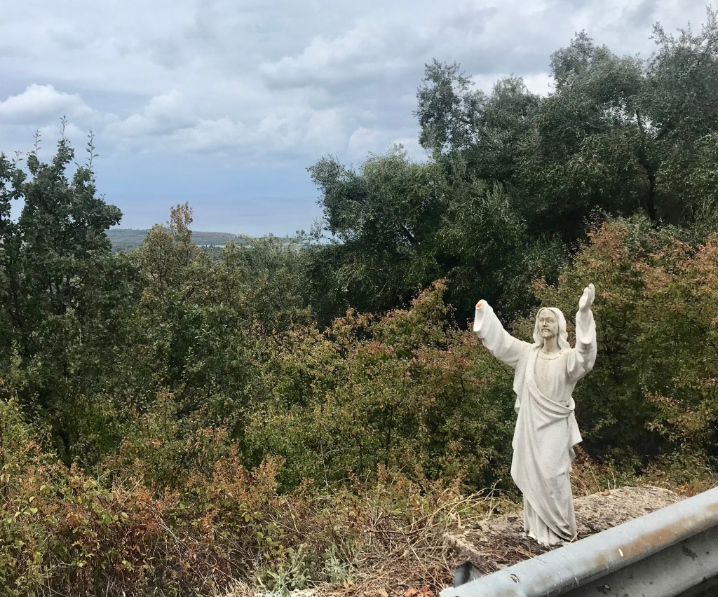 Danach geht’s -vorbei an der inzwischen nur noch einhändigen Jesusfigur an der Straße nach Loutses-nach Ag Stefanos.