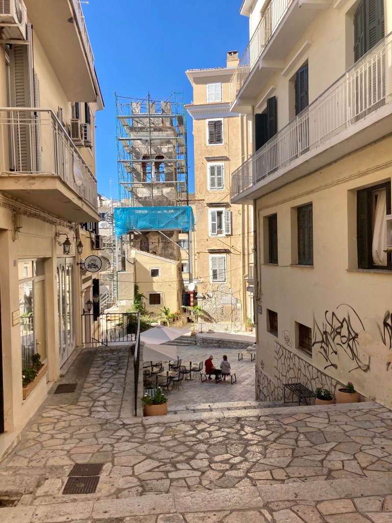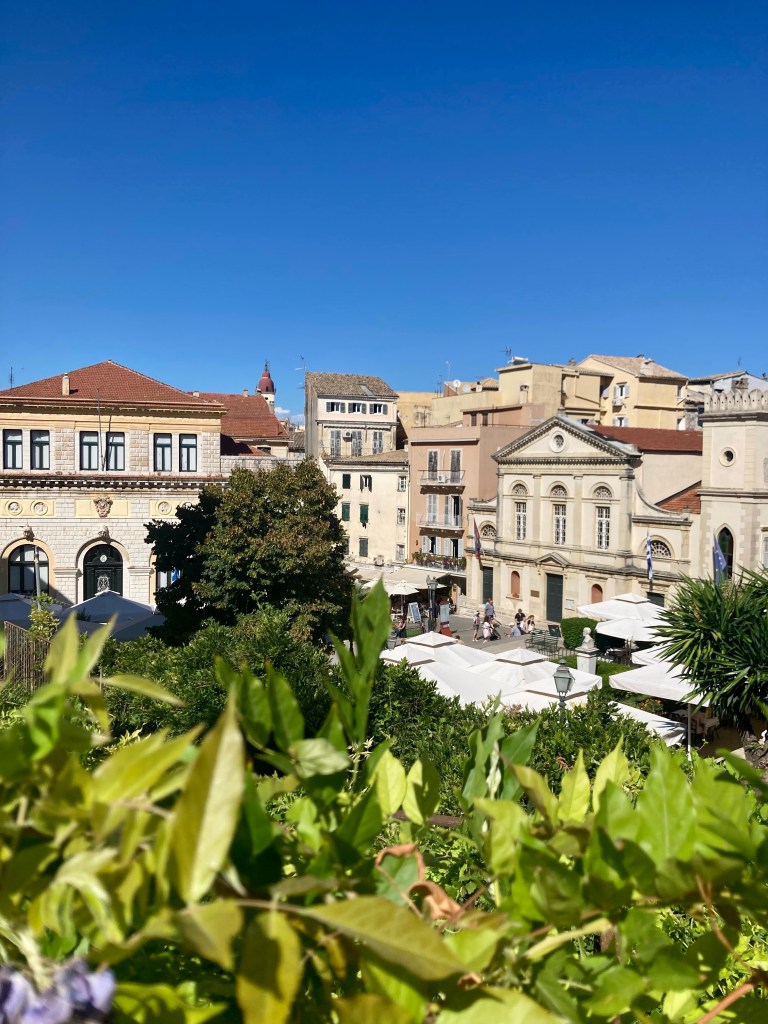 Das Problem des Parkplatzfindens im Zentrum von Korfu haben wir zuvor auf griechische Art gelöst. Der wegen eines Cricketspiels am Nachmittag zentrale Platz ist zwar immer noch gesperrt, wir fahren aber einfach über die eigentliche Abfahrt drauf.