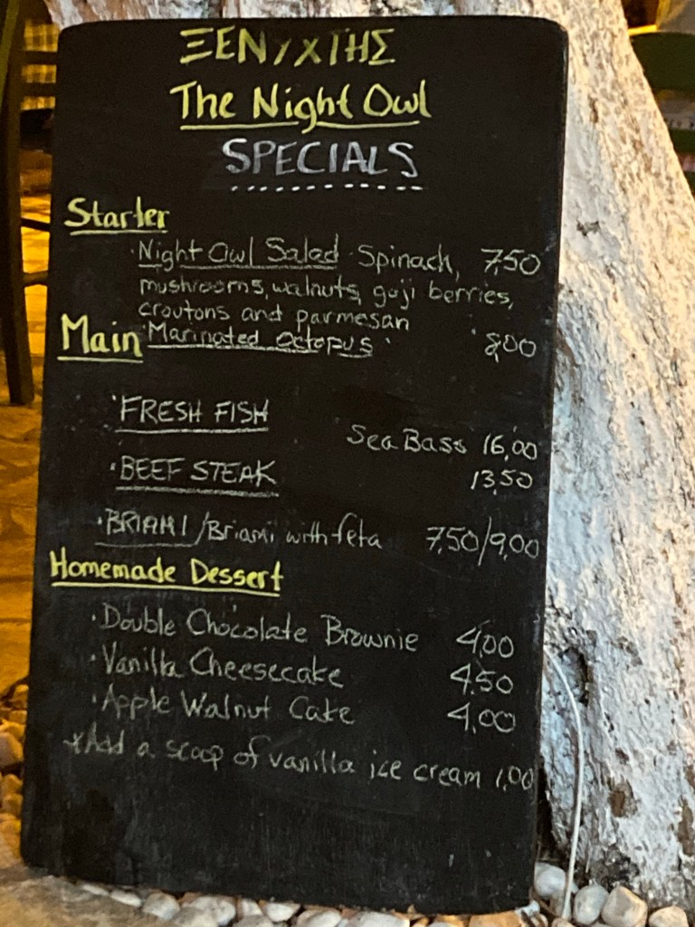 Nach einem Sonnenuntergang mit unbeschreiblichen Rottönen erst ATM, dann „The Night Owl“ in Afionas. Wieder einmal viel zu viel auf dem Tisch. Eine frische Goldbrasse, Souvlaki und Gambas zum Hauptgang. Vorher Knofibrot, Griechischer Salat, eingelegter Oktopus, Taramas, und Tsatsiki. Opulent und tierisch lecker. Nur der Kräuterschnaps hinterher war etwas sehr weihnachtlich angehaucht.
