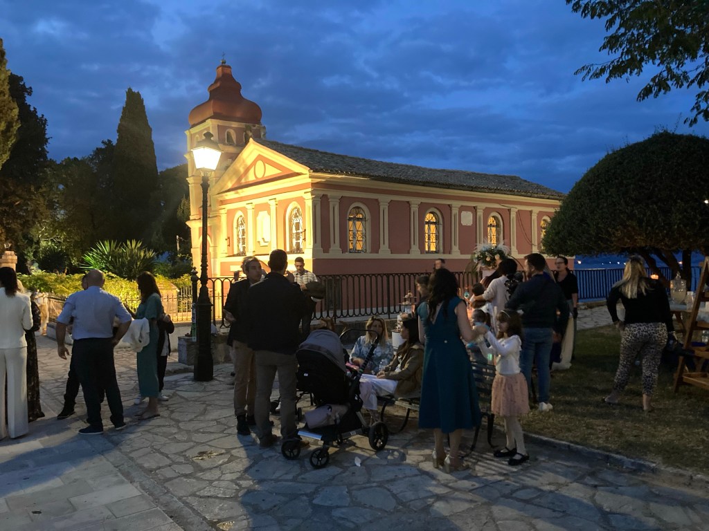 Rund einhundert Gäste kommen zur Feier in die Kirche der Heiligen Maria von Mandrakina in Korfu-Stadt, direkt am Meer zwischen Altem Fort und dem Asiatischen Museum gelegen. Eingerahmt von zwei schönen Grünanlagen. Die Kirche war im 2. Weltkrieg arg in Mitleidenschaft gezogen und wurde in den 1950ern restauriert. Heute finden dort fast ausschließlich Trauungen und Taufen statt.