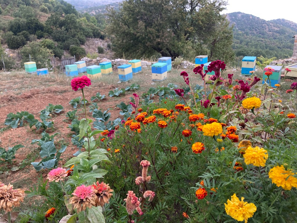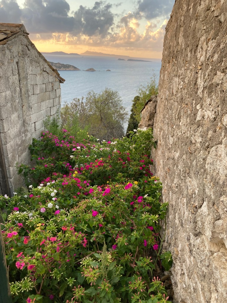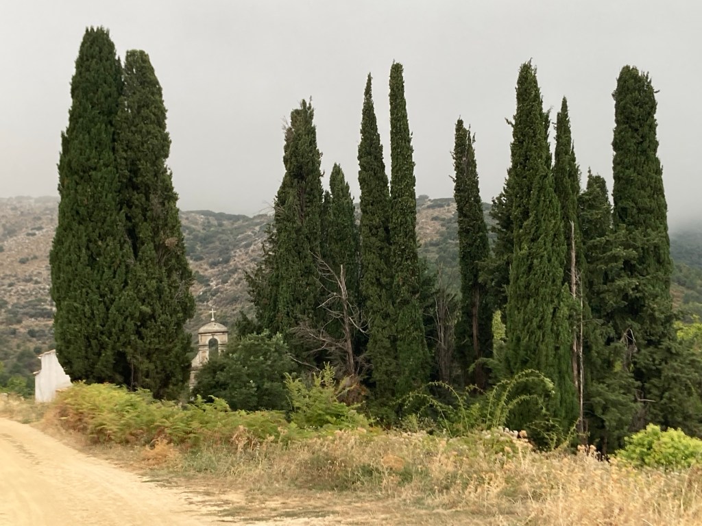 In der Nacht hat es etwas geregnet, aber es ist immer noch 23/24 Grad warm. Mittags fahren wir ins verlassene Dorf Old Perithia, wo uns die nachgereiste Tochter jene Winkel zeigen will, die die Ollen im letzten Jahr nicht gefunden haben. Tatsächlich gibt es sie. Und trotz des grauen Tages erleben wir hier oben knapp unter Wolkengrenze wunderschöne Momente. Wir lassen uns die im großen Stil betriebene Imkerei erklären und kaufen natürlich auch Honig, Creme und Lippenbalsam.