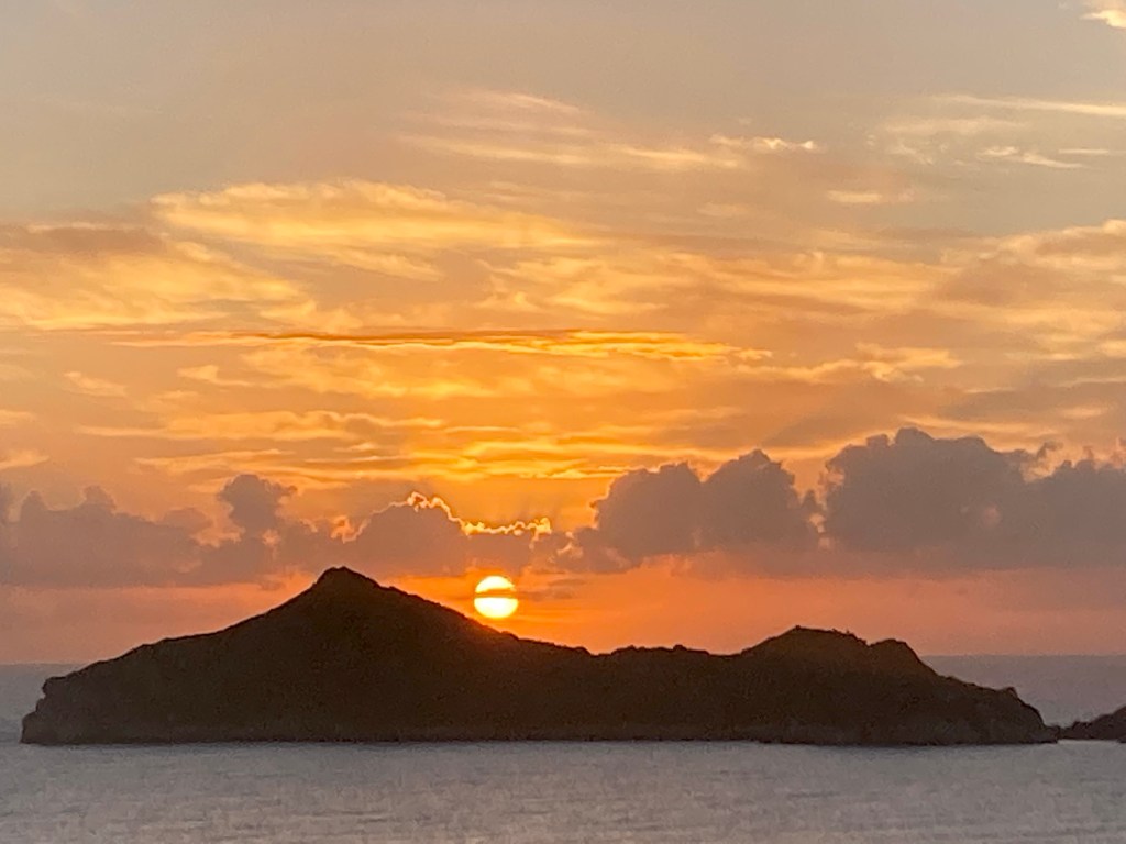 Der Sonnenuntergang ist jedenfalls perfekt. Der rote Ball fällt praktisch aus einem Wolkenstreifen in die See.