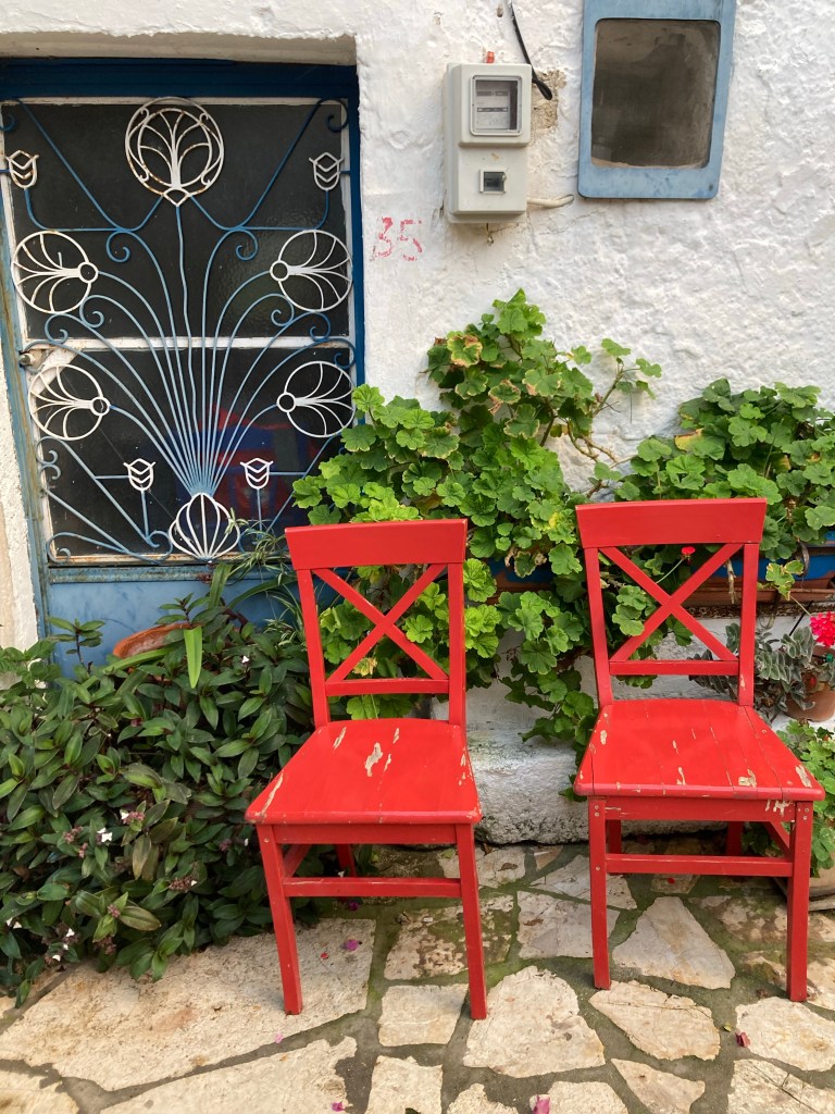 Als wir, nach süßen Trauben und Ouzo auf‘s Haus, aufbrechen wollen, ist die nachgereiste Tochter plötzlich verschwunden. Der Türmechanismus auf dem WC hat sich verhakt und entlässt sie erst nach einiger Zeit aus der misslichen Lage.