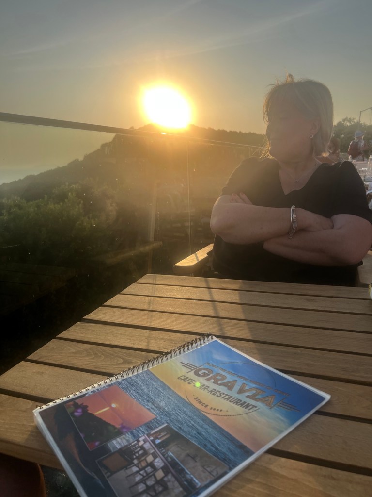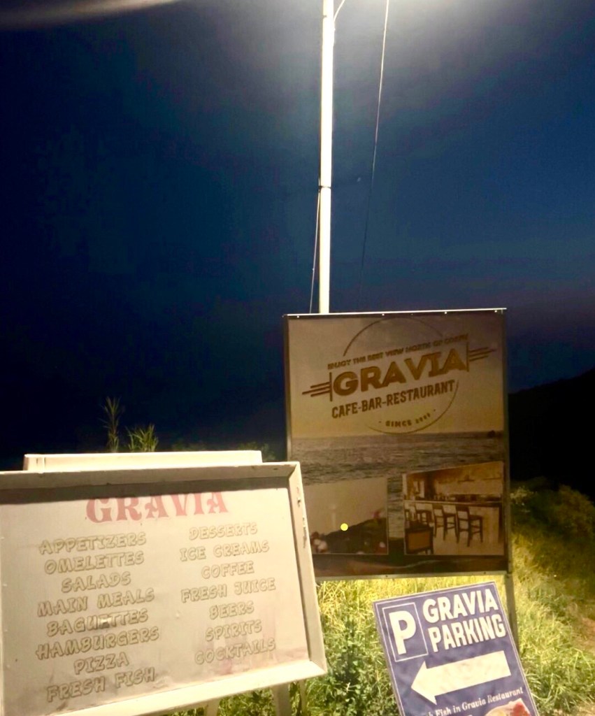 Abends dann Mut zu Neuem. Auf dem Bergrücken zwischen Arillas und Ag Stefanos liegt das „Gravia“. Hier waren wir tatsächlich noch nie. Es ist die erste griechische Lokalität, der das Tsatsiki ausgegangen ist. Fürs Personal peinlich hoch drei. Es wäre halt tagsüber so viel Betrieb gewesen. Wir weichen auf Taramasalat (Bombe!), Pitabread und Greek Salad als Vorspeise aus. Danach überbackener Feta mit Honig und Sesam und Tintenfisch vom Grill. Als Abschluss Lemon Pie und Baklava. Alles top!