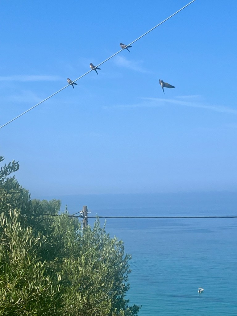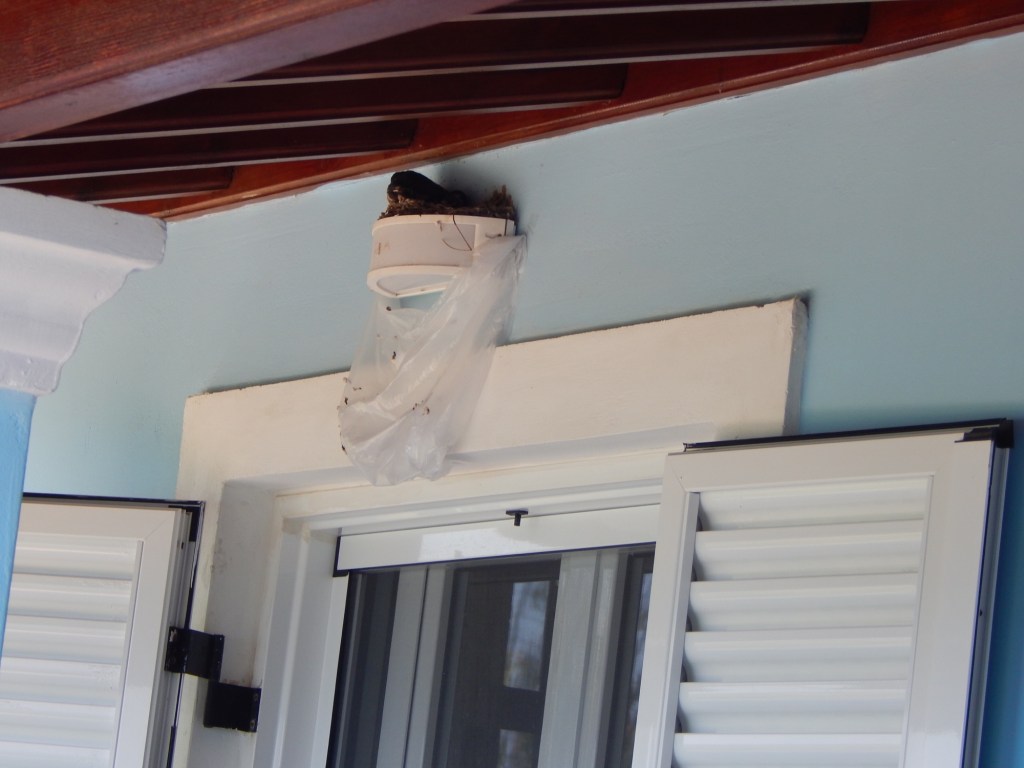 Auf dem Nachbarbalkon rödelt Tommy umher. Er erklärt uns auch den Grund seiner Verzweiflung: „I‘ve got a problem.“ Unter‘m Dach hat sich ein Schwalbenpärchen wohnlich niedergelassen. Die Jungen wären auch bereit, auszufliegen, zögerten aber noch. Wegmachen will er es nicht, weil ein Schwalbennest in Griechenland dem daran klebenden Haus Glück bringen würde. Auch aus Gründen des Tierschutzes widerstrebt ihm das. 2.000,00 Euro Strafe stehen hier auf ein solches Vergehen. Jetzt überlegt er, wie er mit Tesafilm und einer dünnen Plastiktüte die Verschmutzung durch Exkremente so gering wie möglich halten und die heute anreisenden Gäste von der baldigen Abreise des Schwalbennachwuchses überzeugen kann. Wir sind gespannt!