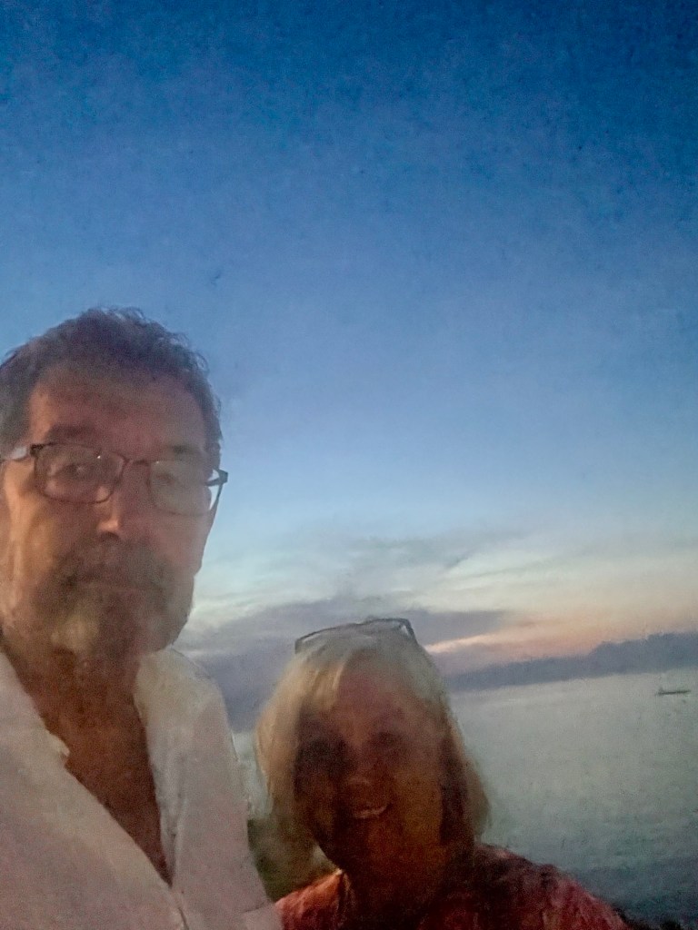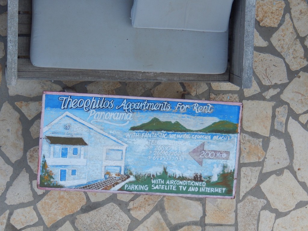 Unsere Gastgeber haben uns zum gemeinsamen Abendessen in die „Old School“ eingeladen. Mit der Einschränkung, dass es bei Angela knapp werden könnte, weil sie nachmittags noch zu einer Beerdigung müsse. Und so kommt es dann auch: sie schafft es nicht und wir landen nach einigem Hin und her im Restaurant „Panorama“ in Afionas.