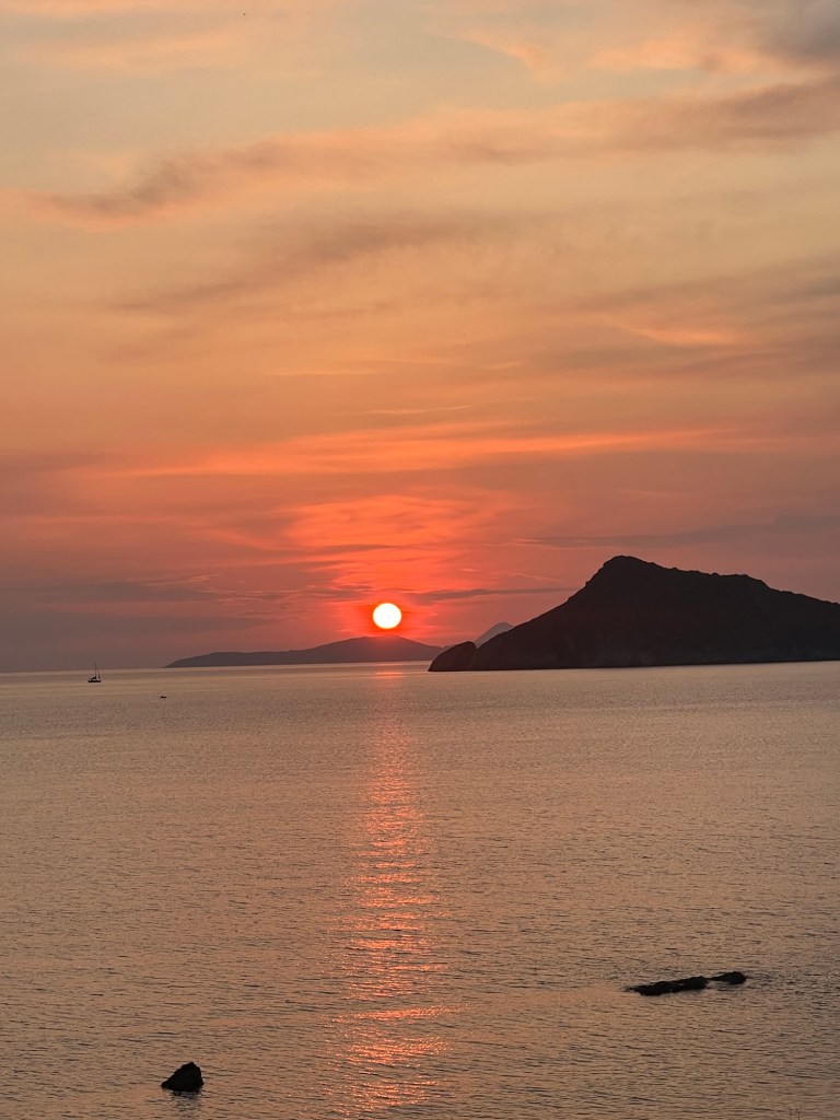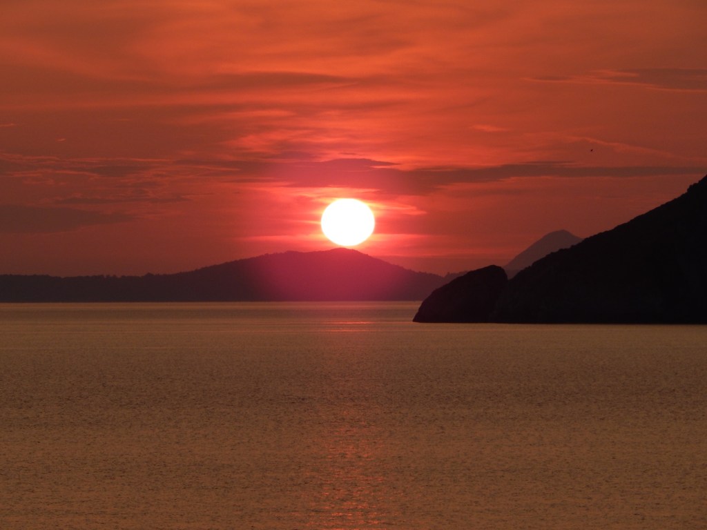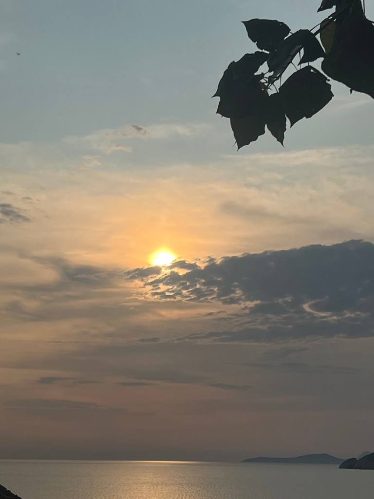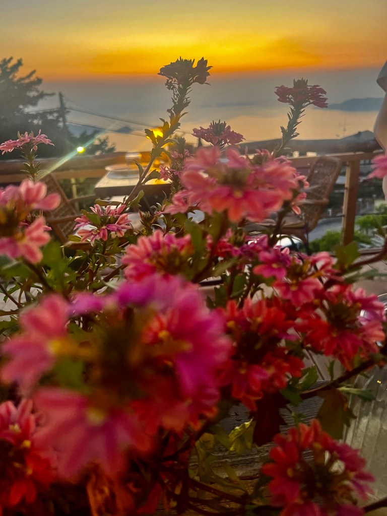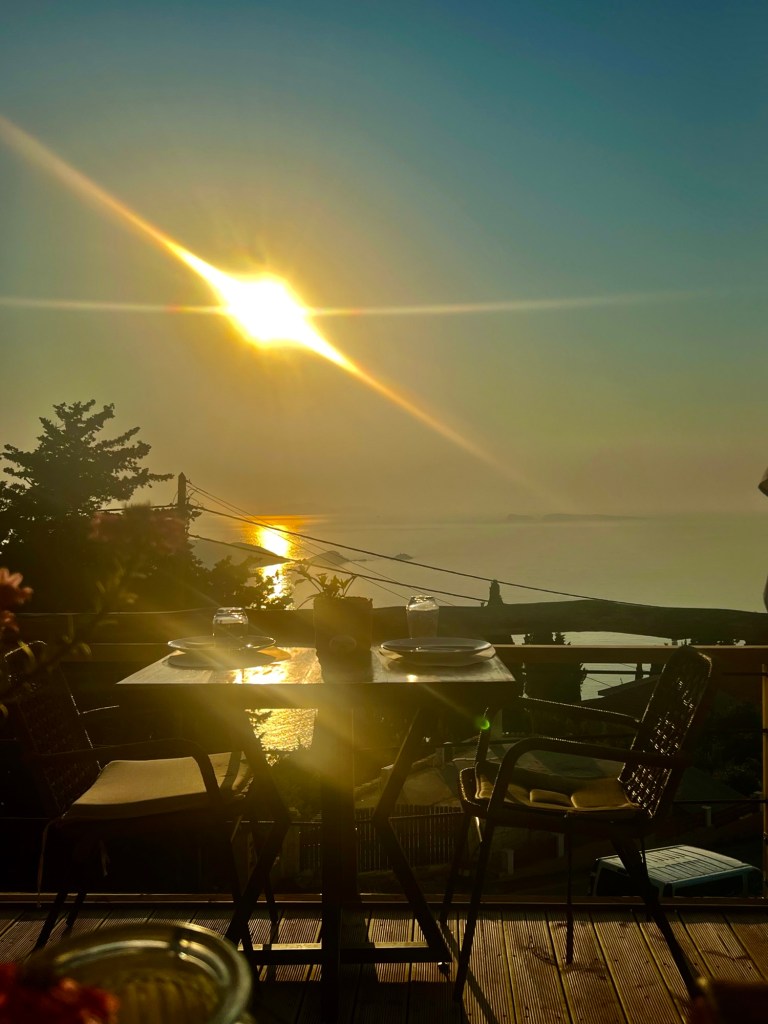 In der Taverne ist gut die Hälfte der Tische besetzt. Unsere (WhatsApp-) Reservierung ist zwar nicht notiert. Aber wen stört‘s? Wir sitzen direkt über‘m Meer und können neben dem Essen einen fantastischen Sonnenuntergang genießen.