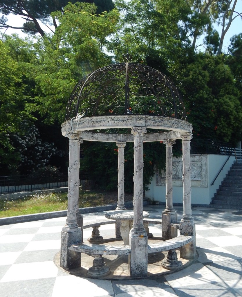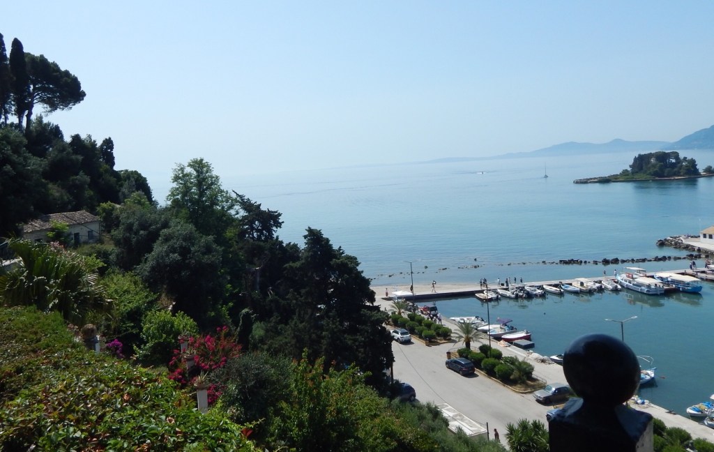 Erst geht‘s nach Kanoni zum Frühstücken. Da haben schon 30 Reisebusse (im Hafen liegen zwei Riesen-Kreuzfahrtschiffe vor Anker) Karawanen von Touris abgeladen. Aber die sind flott durchgeschleust. Und wir entdecken tatsächlich neues: eine Aussichtsterrasse samt antikem „Hochzeitspavillon“ und ein Café mit unverbautem Blick auf die Start- und Landebahn. „Das war letztes Jahr noch nicht da“, sind wir uns ausnahmsweise mal einig.