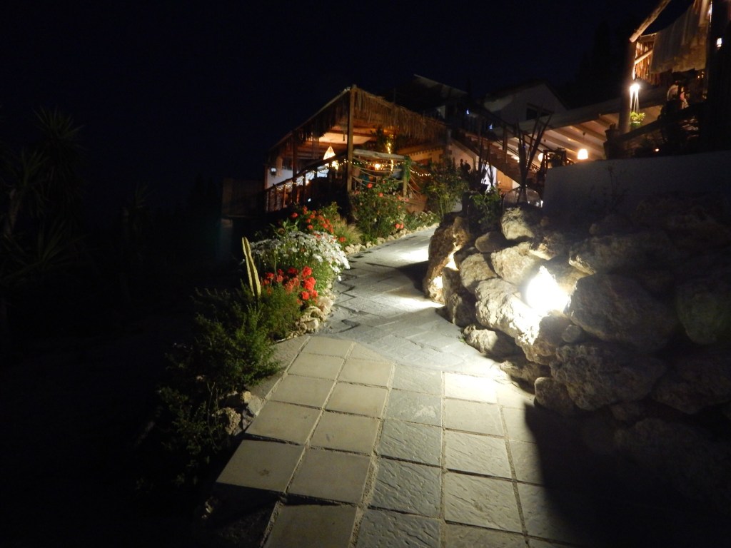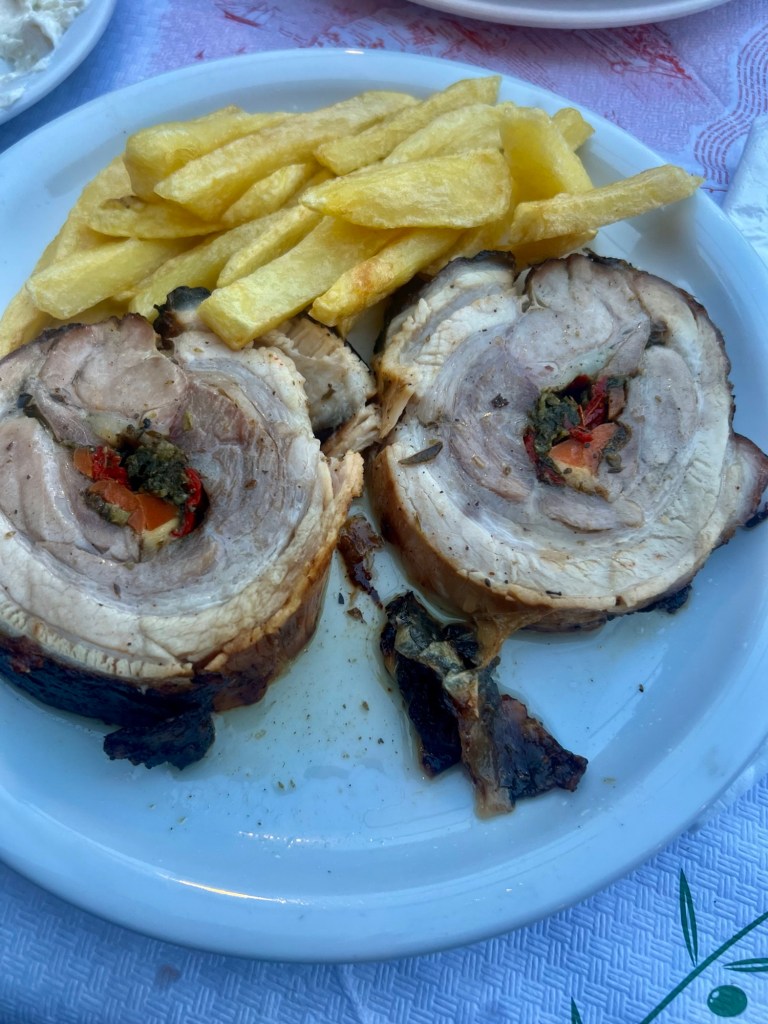 Abends speisen wir im „Alkyon“. Insbesondere das Lamm „Kleftiko“ war ein Gedicht. Dabei wird Lammfleisch mit Gemüse, Kräutern, Kartoffeln und Käse zusammen geschmort und (hier jedenfalls) in Pergamentpapier serviert.