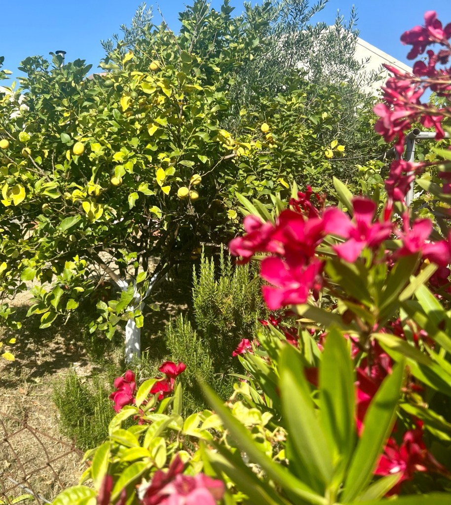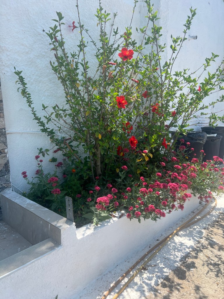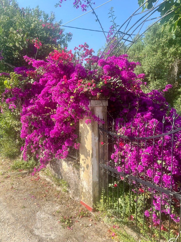 Die Straße runter zu Spiros Supermarkt ist immer noch in einem katastrophalen Zustand. In den Gärten links und rechts blüht es so üppig, wie wir es schon lange nicht mehr gesehen haben.