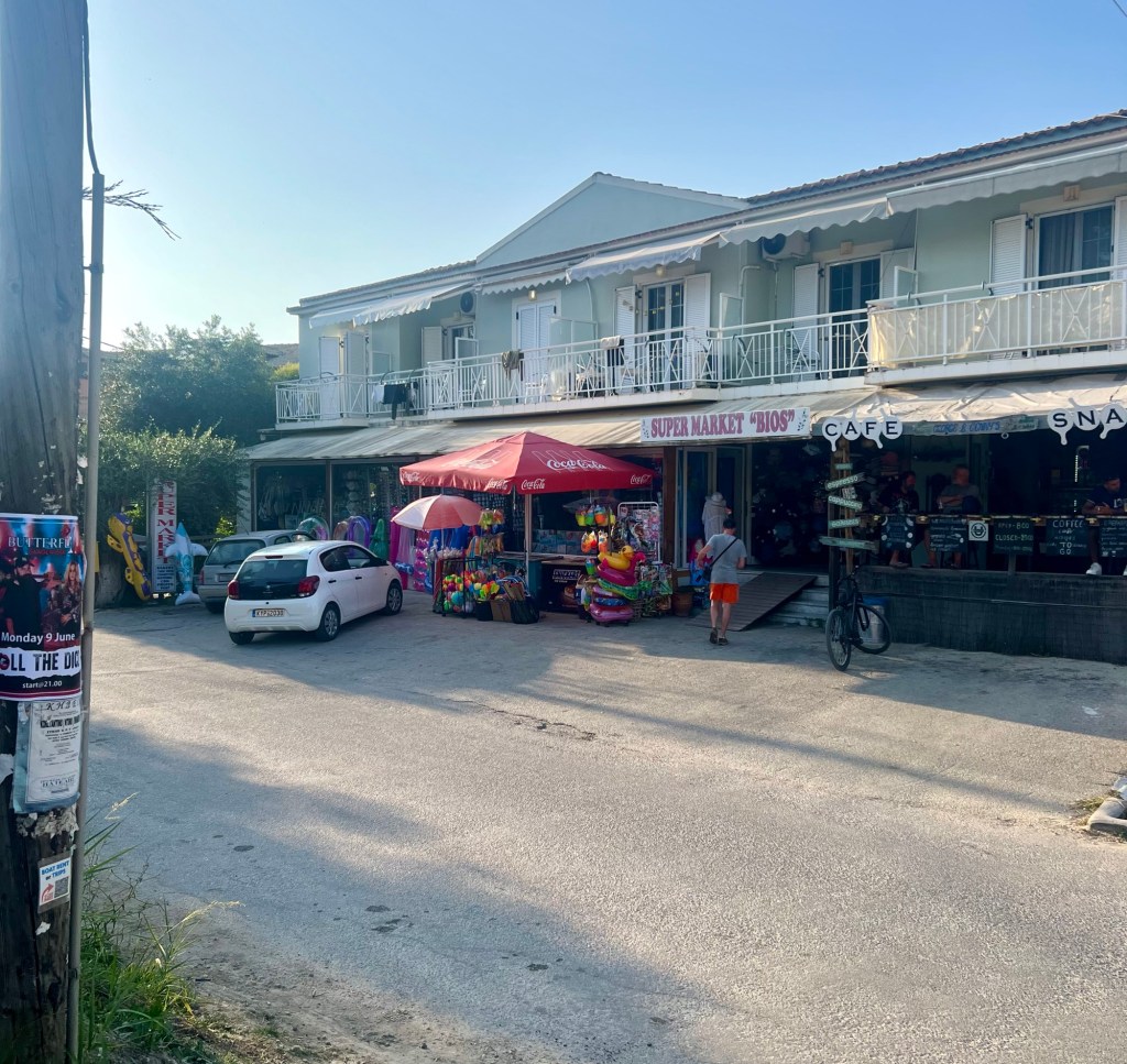 Vor‘m Supermarkt werden wir wie alte Freunde von einem netten Herrn angequatscht, den wir erst mit Verzögerung als Kellner aus der Alkyon-Beachbar identifizieren.