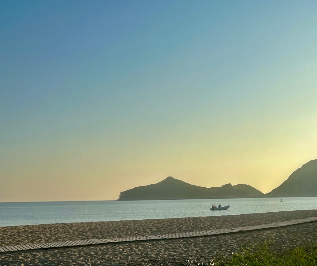 Die Temperaturen legen noch etwas zu. Kaum Wind. Am Strand nix los. „Die Polen lassen uns bisher im Stich“, hatte uns Elena, die Bootsverleih-Chefin erklärt. Das an unserem Strandabschnitt liegende „Alkyon“ ist ein AI-Hotel, das hauptsächlich von polnischen und tschechischen Veranstaltern gebucht wurde. Die seien jetzt zur Ostküste abgewandert. Meint jedenfalls Elena.