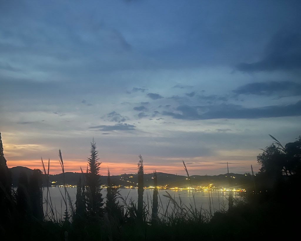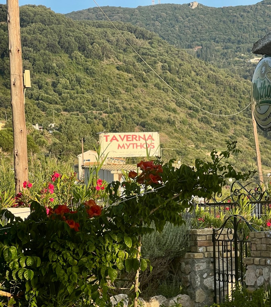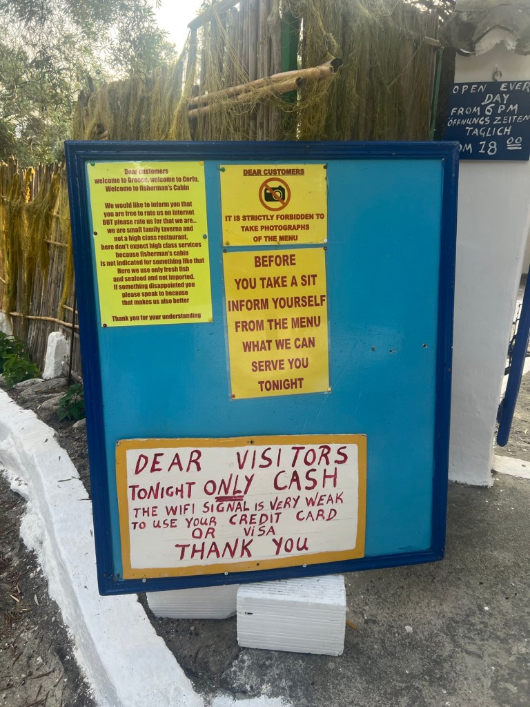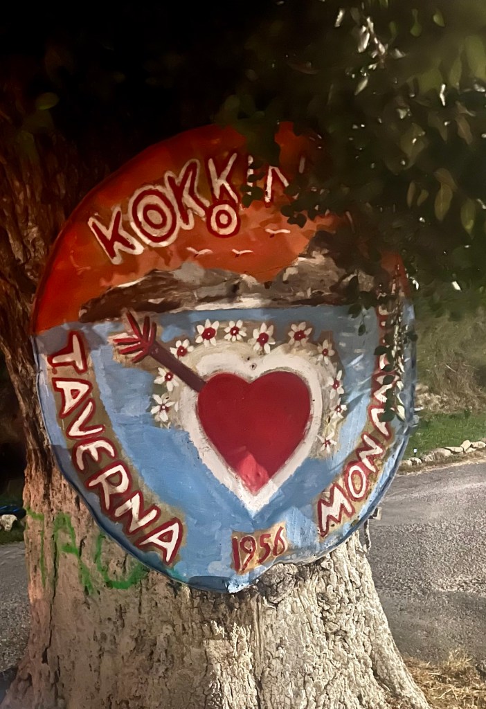 Wir fahren zum Essen ins „Mon Amour“. Selbst die haben jetzt einen Ruhetag und erst ab 18 Uhr geöffnet. Nicht viel los heute. Großes Begrüßungshallo und ein Tisch im Außenbereich. Wir bleiben beim Klassiker: Taramasalat, Tsatsiki (scharf), Pitabread, Saganaki und Lamm aus‘m Oven. Alles mega lecker. Besonders das Tarama. Die scheinen auf Korfu ein neues Rezept zu haben. Das war gestern schon so lecker.