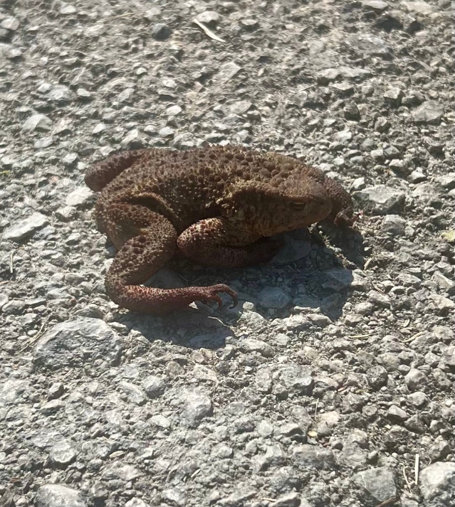 Auf dem Weg hoch zum Haus -wir sind ja zu Fuß unterwegs- kollidiere ich tatsächlich mit einer großvolumigen Kröte, die mit ihren Geschwistern die Straße für sich beansprucht. Igittigitt.