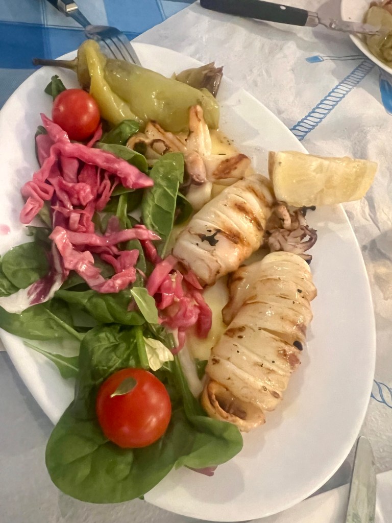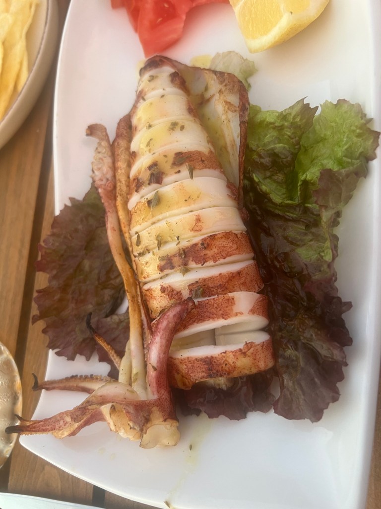 Danach Tintenfischringe und eine fangfrische Seebrasse vom Grill. Inklusive Getränke allerdings mit 70,00 Euro auch nicht ganz billig.