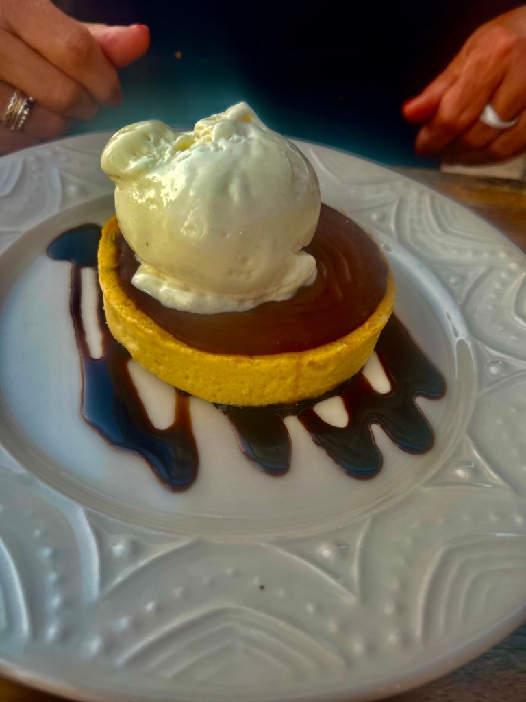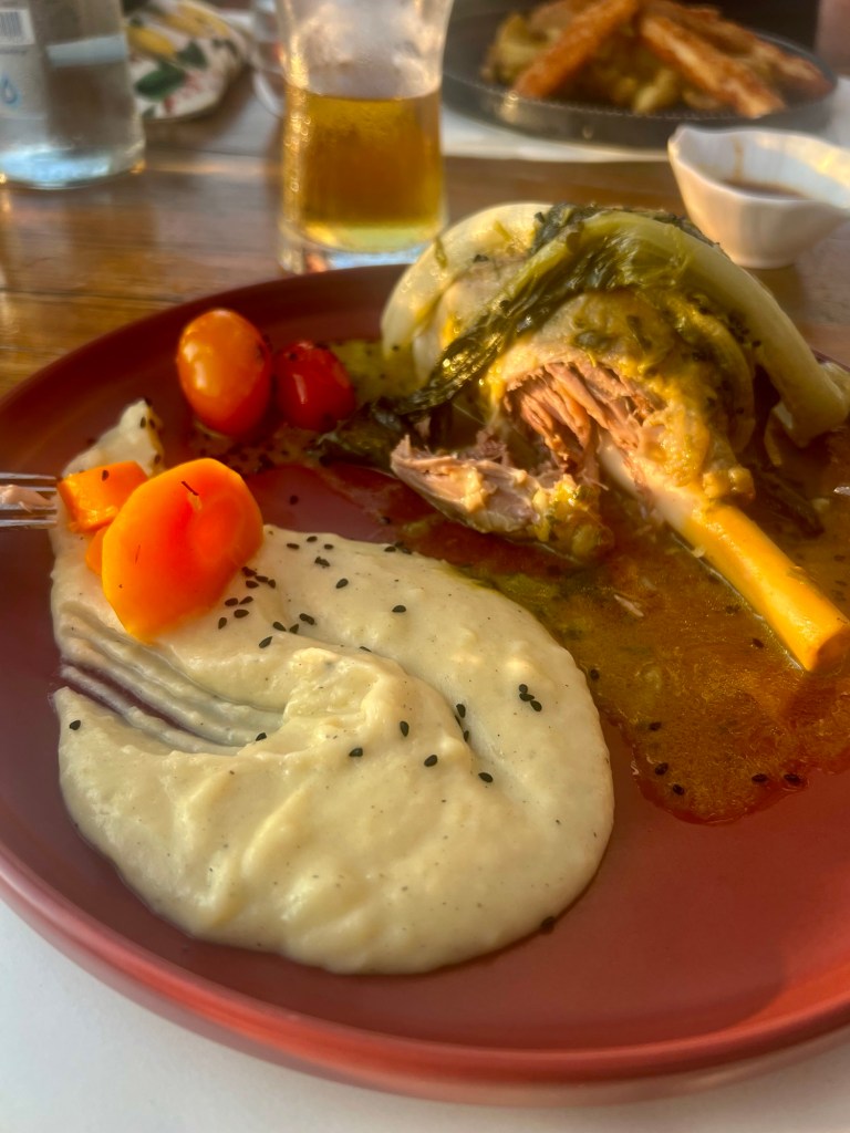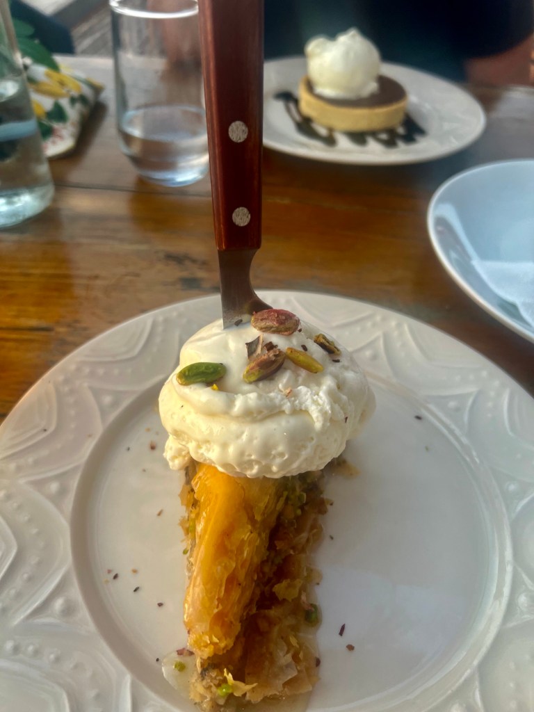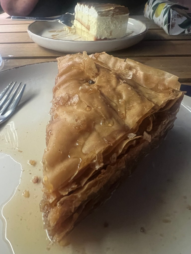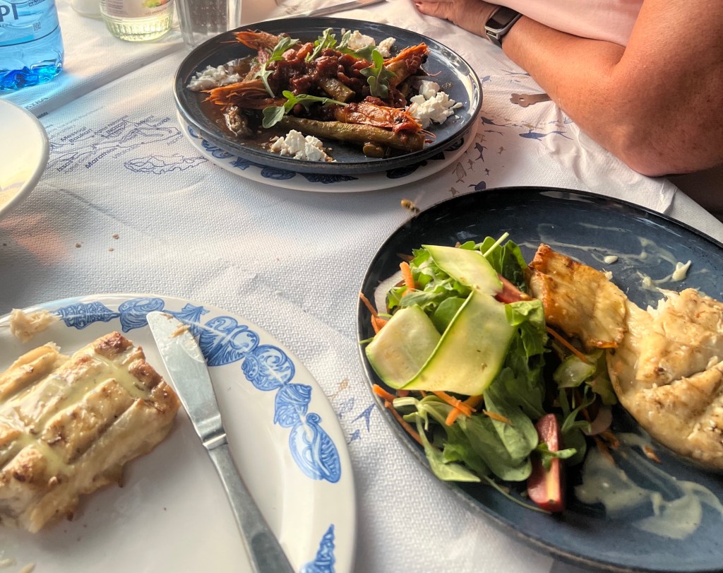 Die Reservierung wäre gar nicht nötig gewesen. Der stillste Tisch ist unserer, weil es von den anderen so viel interessantes aufzuschnappen gibt. Zum Glück sprechen hier alle unsere Sprache. Wir nehmen den griechischen Salat, Tsatsiki mit Pita, überbackenen Fetamit Honig und Lammkoteletts. Zum Dessert Μillefeuille Und noch‘n Pott Bier vom Fass.