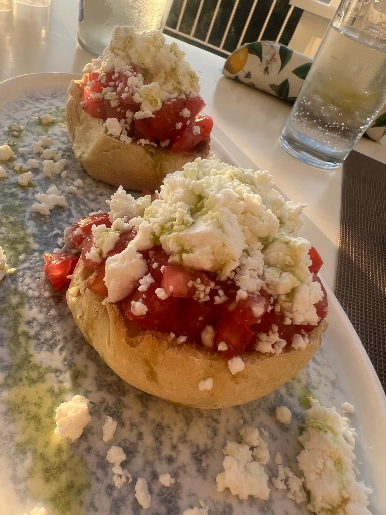 Zu Beginn gibts griechisches Bruscetta mit Olivenöl, jede Menge Knofi und Tomatenstückchen auf frisch angetoastetem Baguette, getoppt mit Fetakäse und ultrakurz überbacken, auf Ruccola-Blättern.
